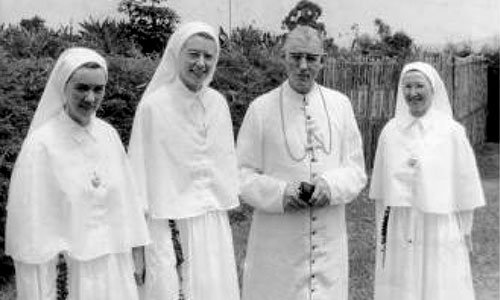 In 1967, Bishop Vincent McCauley, CSC, second from right, Diocese of Fort Portal, asked Holy Cross sisters to come to Uganda. Left to right, Sisters M. Catherine de Ricci (Bartels), CSC, and Patricia Gantz, CSC, were the first two founding sisters for the mission. At right is Sister M. Olivette (Whalen), CSC, who accompanied them as mission coordinator.